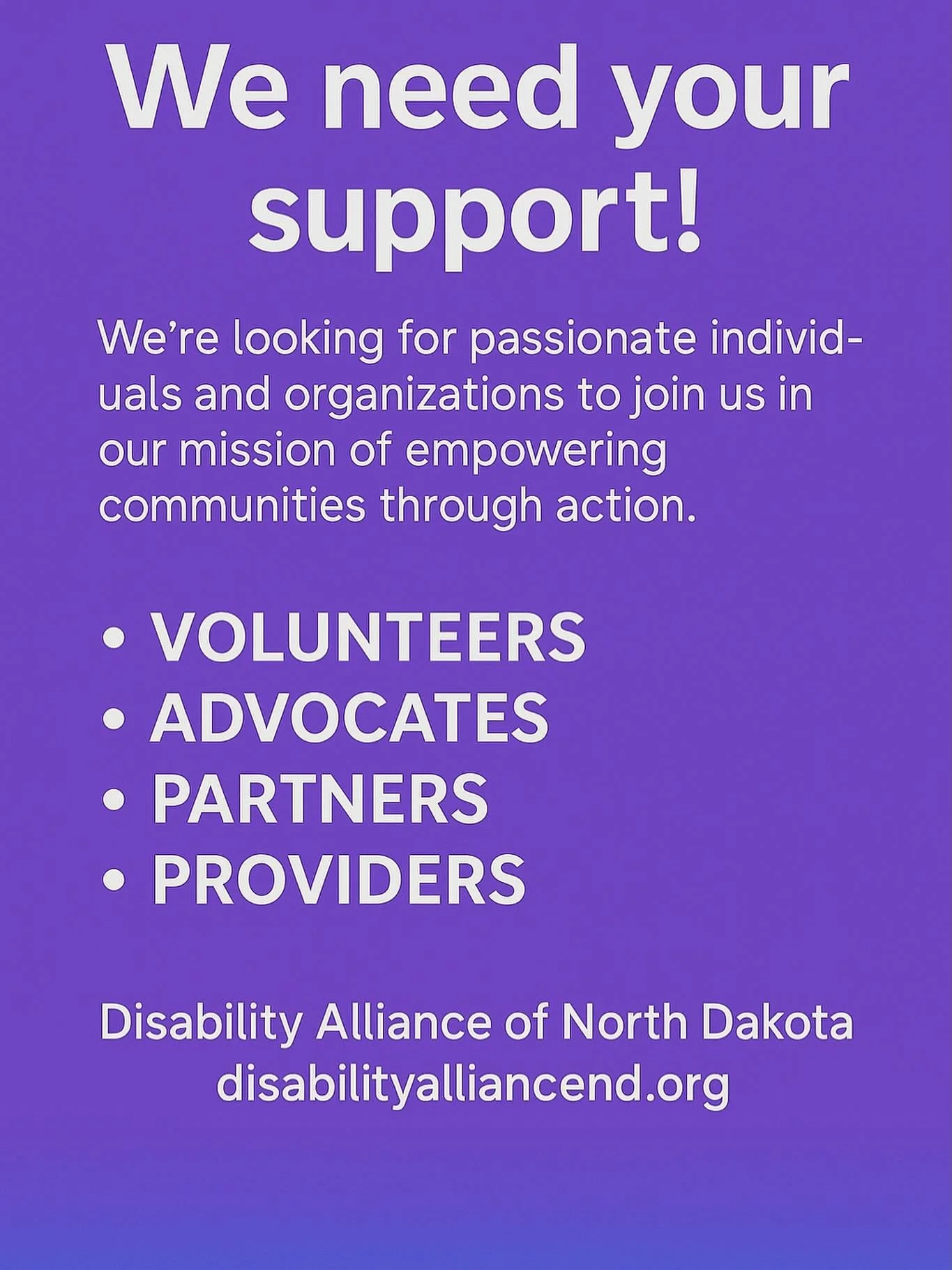 The Disability Alliance of North Dakota is a community-driven organization dedicated to advancing accessibility, dignity, and equity for people with disabilities across our state. We believe that every individual deserves the opportunity to thrive, be heard, and actively participate in their communities.